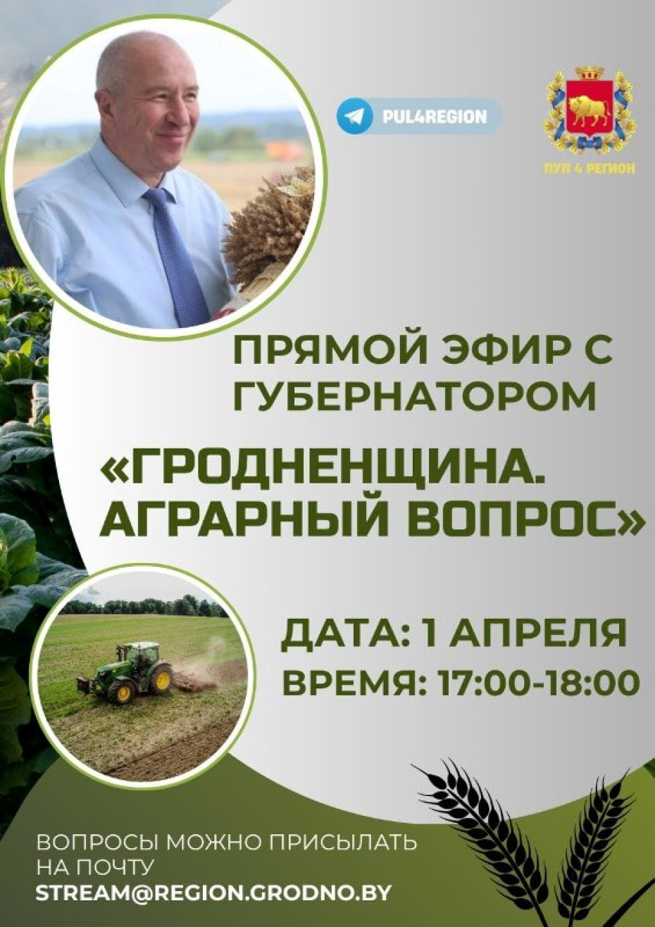 Свои вопросы по тематике работы аграрного сектора: развитию растениеводства и животноводства, выпуску сельхозпродукции, сохранности поголовья скота, привлечению кадров, повышению качества жизни на селе и прочие можно направлять предварительно по электронной почте на адрес: stream@region.grodno.by до 30 марта включительно.