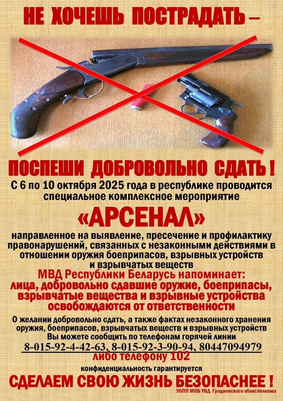 В целях активизации работы органов внутренних дел по предупреждению преступлений с применением оружия, изъятию незаконно хранящегося оружия, боеприпасов, взрывчатых веществ и взрывных устройств на территории Республики Беларусь в период с 6 по 10 октября 2025 года будет проводиться специальное комплексное мероприятие «АРСЕНАЛ».