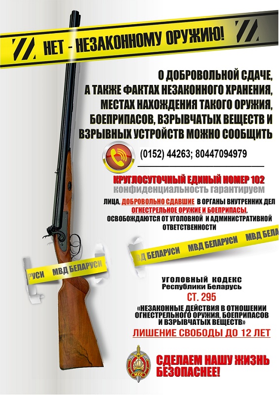 Граждан, обладающих информацией о незаконном хранении оружия, просим позвонить в милицию по телефону 102, или инспектору по разрешительной работе по телефонам: 44263 или 8 (044) 7094979. Телефон горячей линии «ПРОЩАЙ ОРУЖИЕ!» УВД Гродненского облисполкома 8-0152-79-72-07. Анонимность гарантирована.