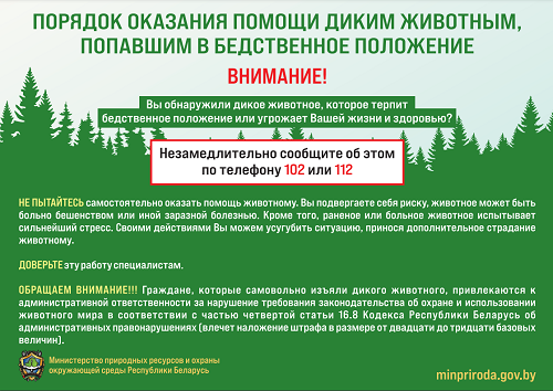 Обращаем внимание. Если Вы обнаружили дикое животное, которое терпит бедственное положение или угрожает Вашей жизни и здоровью незамедлительно сообщите об этом в оперативно-дежурную службу территориального органа внутренних дел или в дежурную службу районного отдела по чрезвычайным ситуациям.