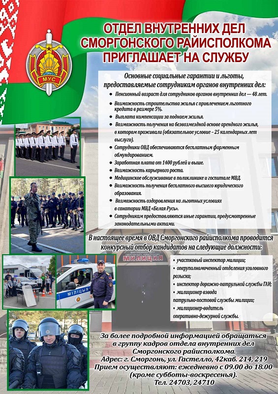 Если Вы решили связать свою дальнейшую деятельность с правоохранительными органами, приглашаем Вас пройти собеседование в группе кадров отдела внутренних дел Сморгонского райисполкома. Вам будет разъяснен порядок приема на службу в органы внутренних дел Республики Беларусь, льготы и гарантии для сотрудников ОВД, а так же будут предложены имеющиеся вакантные должности. Обращаться по адресу: г. Сморгонь, ул. Гастелло, 42; тел.24710, 24703; каб. 214, 219.