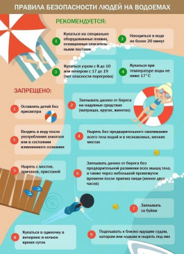 Совсем скоро можно открывать купальный сезон. Не будет лишним вспомнить важные правила: купайтесь в специально отведенных местах, на оборудованных пляжах; не заходите в воду в состоянии алкогольного опьянения; избегайте купания в одиночестве, особенно если вы не уверены в своих силах, в вечернее и ночное время суток; плавайте вдали от идущих судов, катеров, лодок, плотов, не ныряйте под них; не заплывайте за буйки и другие ограждения; не упускайте из поля зрения своего ребенка и не отпускайте его на водоем без взрослых.