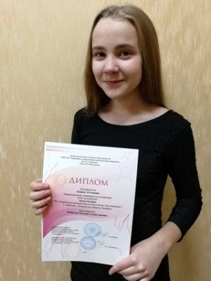 Сливницина Амелия в номинации «инструментальное исполнительство, фортепиано» награждена дипломом лауреата I степени на Международном конкурсе-фестивале искусств «Этажи» (г.Минск, 12 января 2020 г.). Учитель Телего Жанна Леонидовна отмечена благодарностью от организаторов конкурса!
