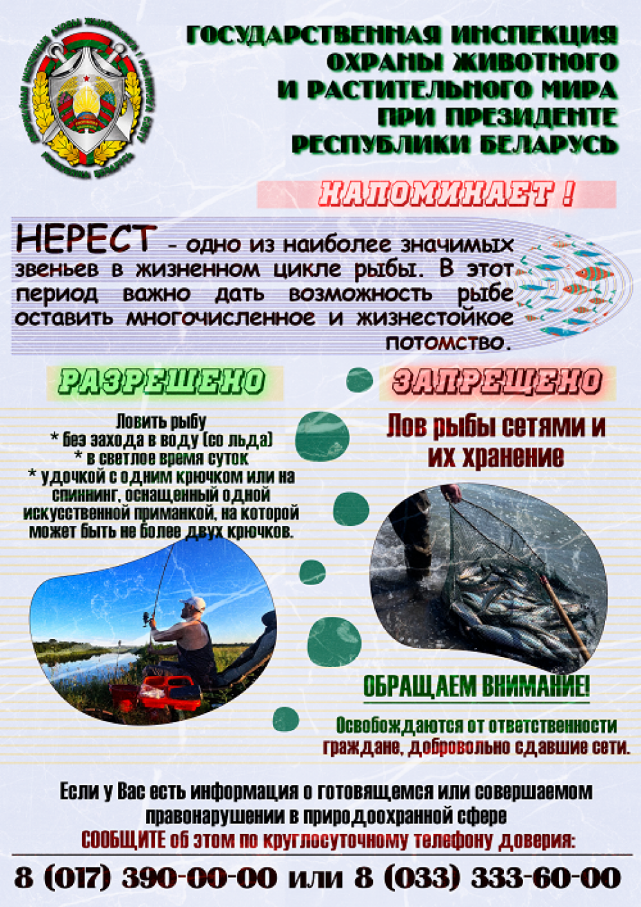 В связи с общим весенним запретом Государственной инспекцией охраны животного и растительного мира при Президенте Республики Беларусь в период с 1 апреля по 30 мая 2024 года на территории Гродненской области проводится специальное комплексное мероприятие «Нерест» основными задачами которого определены: