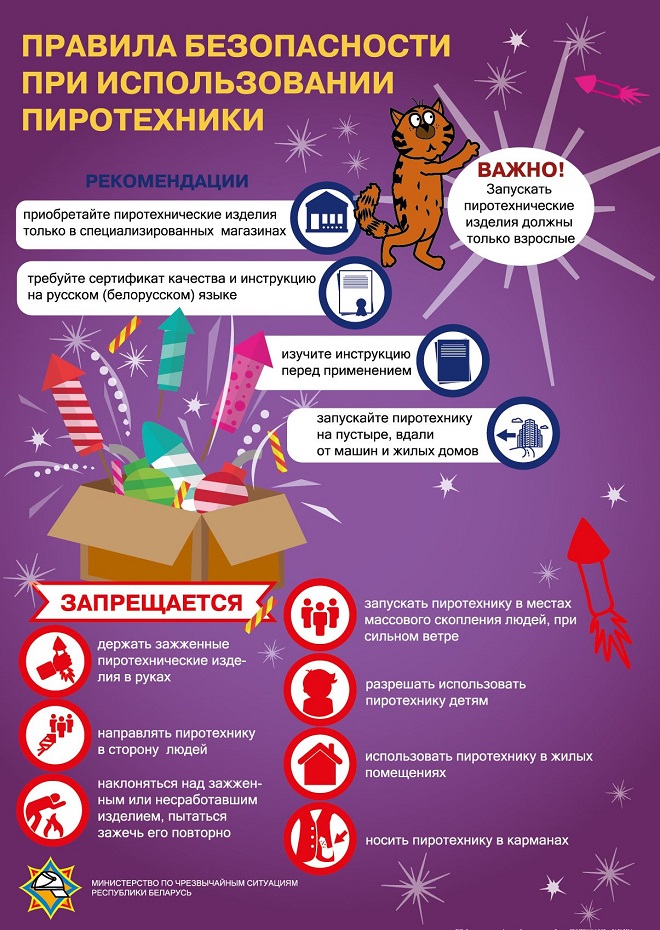 Период зимних праздников сопровождается увеличением количества пожаров и травм из-за нарушения правил пожарной безопасности и неосторожного обращения с пиротехническими изделиями. С целью предупреждения подобных чрезвычайных ситуаций с 11 по 29 декабря на территории Сморгонского района проходит ежегодная информационно-пропагандистская акция «Безопасный Новый год!».
