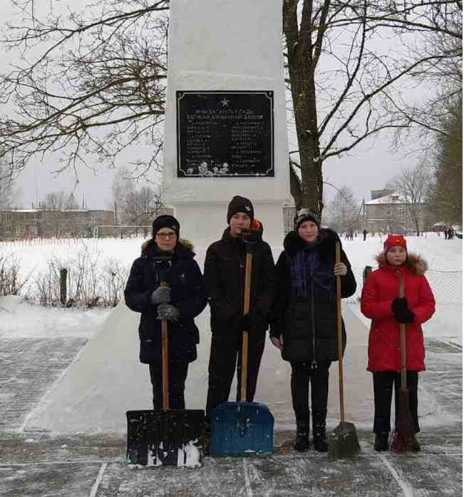 В рамках республиканской акции «Зимняя пора добрых дел» волонтёрский отряд «Добрые сердца» Сыроваткинской базовой школы вышел на уборку снега. Ребята привели в порядок территорию возле памятника воинам, погибшим в годы Великой Отечественной войны.