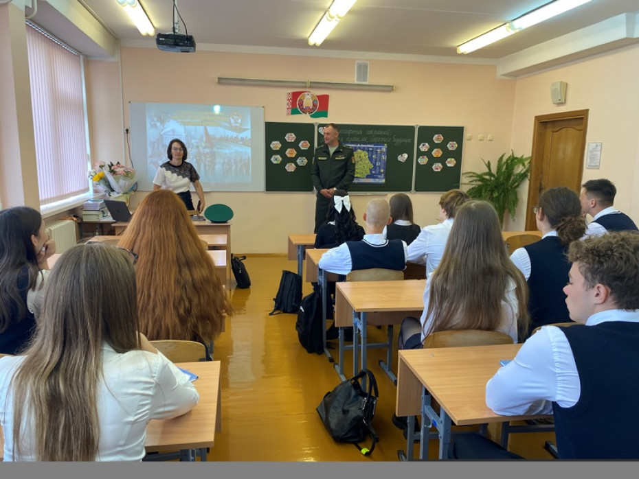В средней школе №7 г. Сморгони урок знаний «Эстафета поколений: сохраняя прошлое, создаем будущее!» в 11-х классах провел начальник отдела кадров подполковник Вадим Слабко.