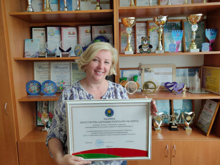 Благодарность Министерства образования Республики Беларусь пяти коллективам Гродненской области вручила Т. В. Осмоловская, консультант управления социальной, воспитательной и идеологической работы Министерства образования Республики Беларусь. Среди награжденных есть и образцовая вокальная группа эстрадной песни «Радость» Сморгонского районного центра творчества детей и молодежи, которой руководит талантливый педагог Вероника Буринская. Такую высокую награду коллектив получил накануне своего двадцатипятилетнего юбилея.