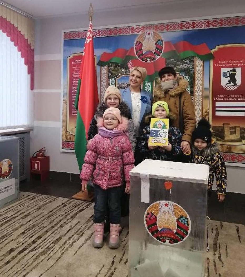 В рамках акции "Всей семьей на выборы", которую проводит общественное объединение «Белорусский союз женщин», председатель районной организации Анна Джумкова поздравила семьи, которые пришли на избирательные участки вместе с детьми.