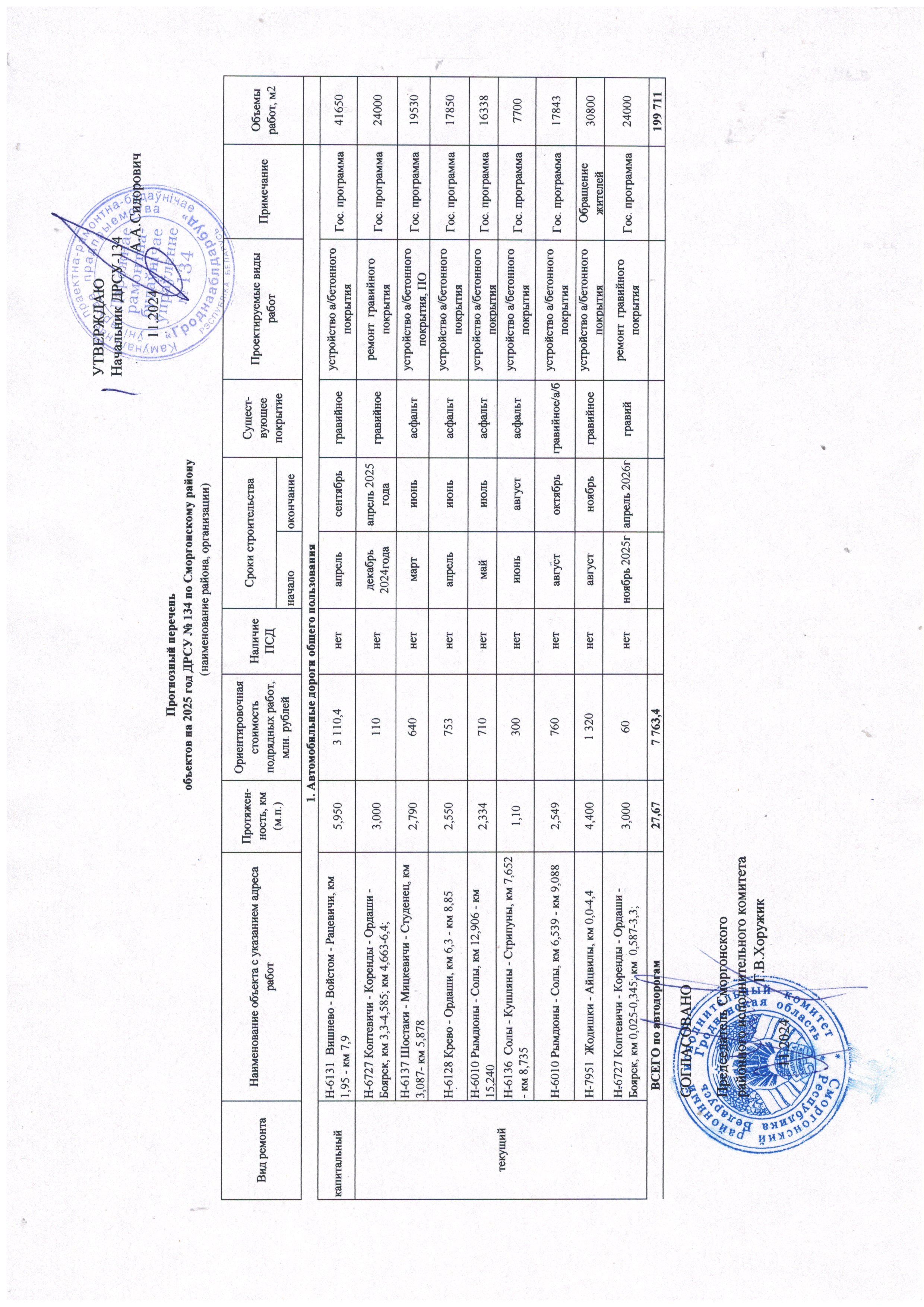 Прогнозный перечень объектов на 2025 год ДРСУ № 134 по Сморгонскому району